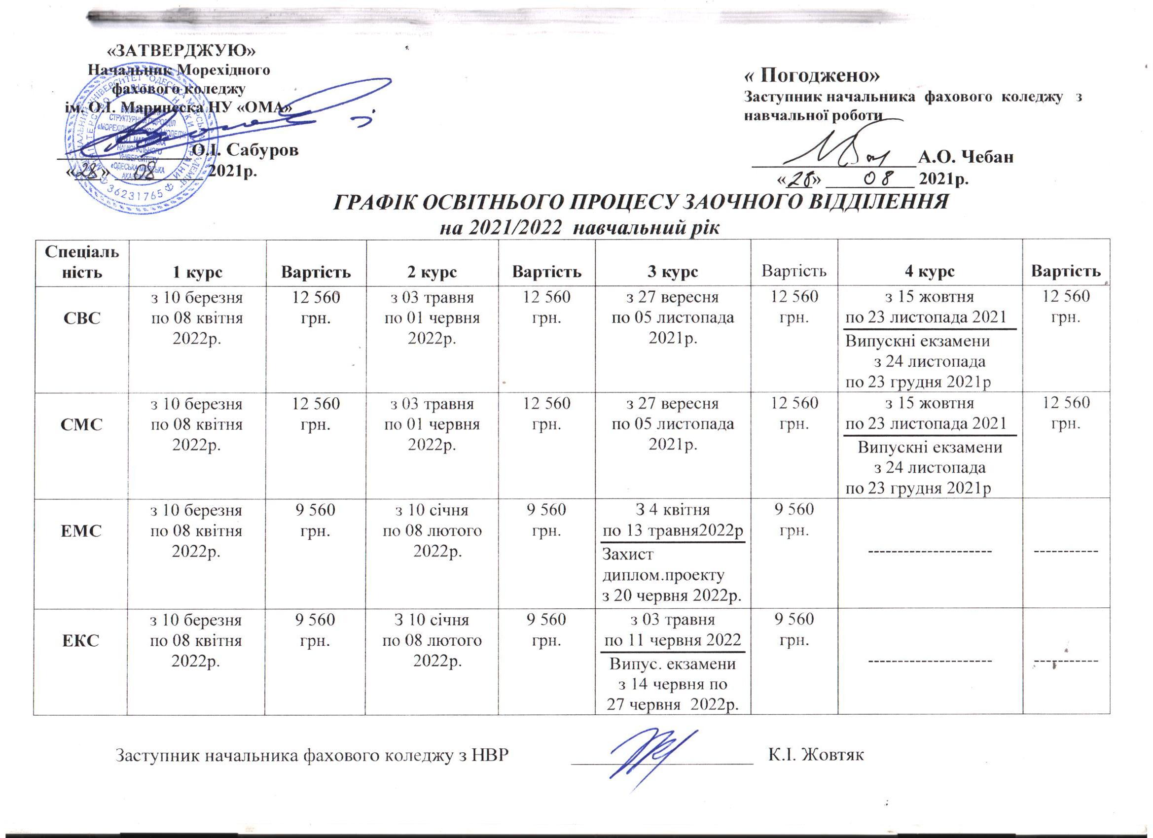 Графік навчального процесу на 2021/2022 навчальний рік (заочне відділення)